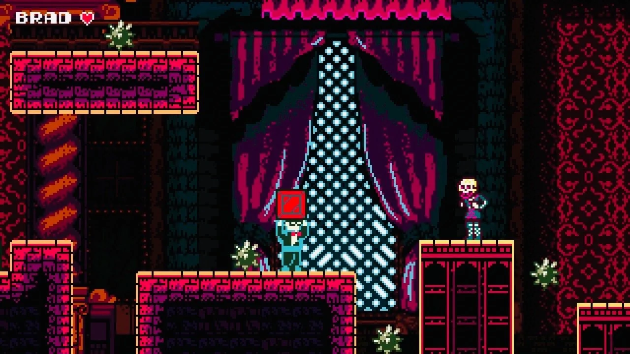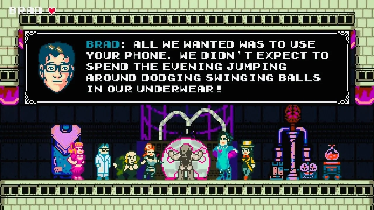 It’s no understatement that the environments in this game are absolutely dripping with love for the movie. But at the same time there are also plenty of nods and winks to classic games of the era to be found scattered throughout. The opening crawl (and accompanying chip tune) is lifted straight from The Legend of Zelda, your approach to Dr. Frank-N-Furter’s digs recalls the opening of Castlevania, and the gameplay itself is sort of a hybrid between Super Mario Bros. 2 and Chip ‘n Dale’s Rescue Rangers. Even your “health meter” is a play on Arthur in Ghosts ‘n Goblins, where after a couple of enemy hits you’ll find yourself scurrying around in your tighty whities. At least for Brad, Janet only takes one hit before a restart and remains fully clothed. Which may ruffle some feathers, but hey as they say: Never look a gift 8-bit Tim Curry in the mouth.