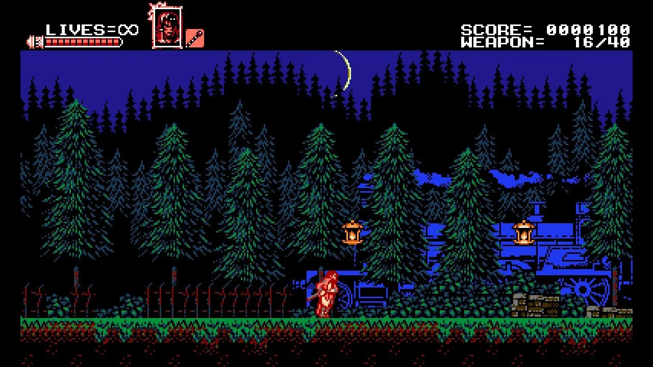 Right off the bat, the atmosphere makes it perfectly clear that you are for all intents and purposes indeed playing Castlevania here my friend. The characters all have different names and Dracula is nowhere to be seen, but this nerd wasn’t born yesterday. From the outset you take control of Zangetsu, a suspiciously familiar looking character on an epic quest to kill the last boss of the game. But Zangetsu is Simon Belmont in sprite only, as his signature weapon is a sword and not the legendary vampire killer whip. Got that? HUGE difference ok? (Well one of his sub-weapons does happen to be a long chain that grants a pretty neat long range attack, but again: not the same dude). The first stage nicely sets the tone for the entire experience, as a massive steam locomotive barrels through the midnight woods behind you and man, that thing looks real cool. It’s the first of many thrilling graphical flourishes you’ll come across and believe you me, they go a long way toward making you grin like an idiot.