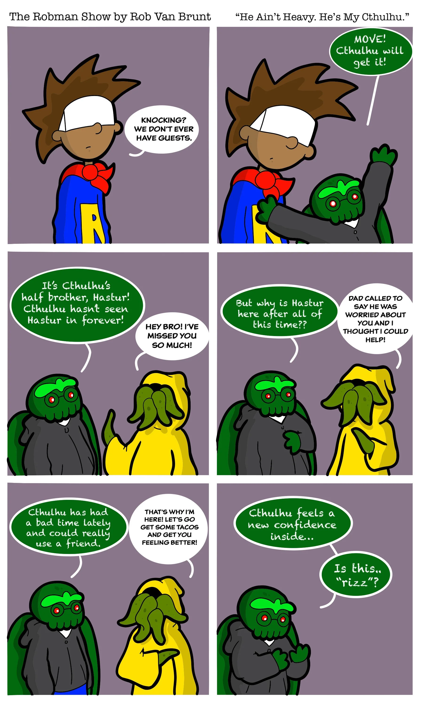 THE ROBMAN SHOW! Episode 131 “He Ain’t Heavy. He’s My Cthulhu” Featured Mar 8 Written By Rob Van Brunt A new comic strip every Sunday morning from Rob Van BruntFollow The Robman Show on Instagram Rob Van Brunt For Classic Robman Show Comics Click Here!