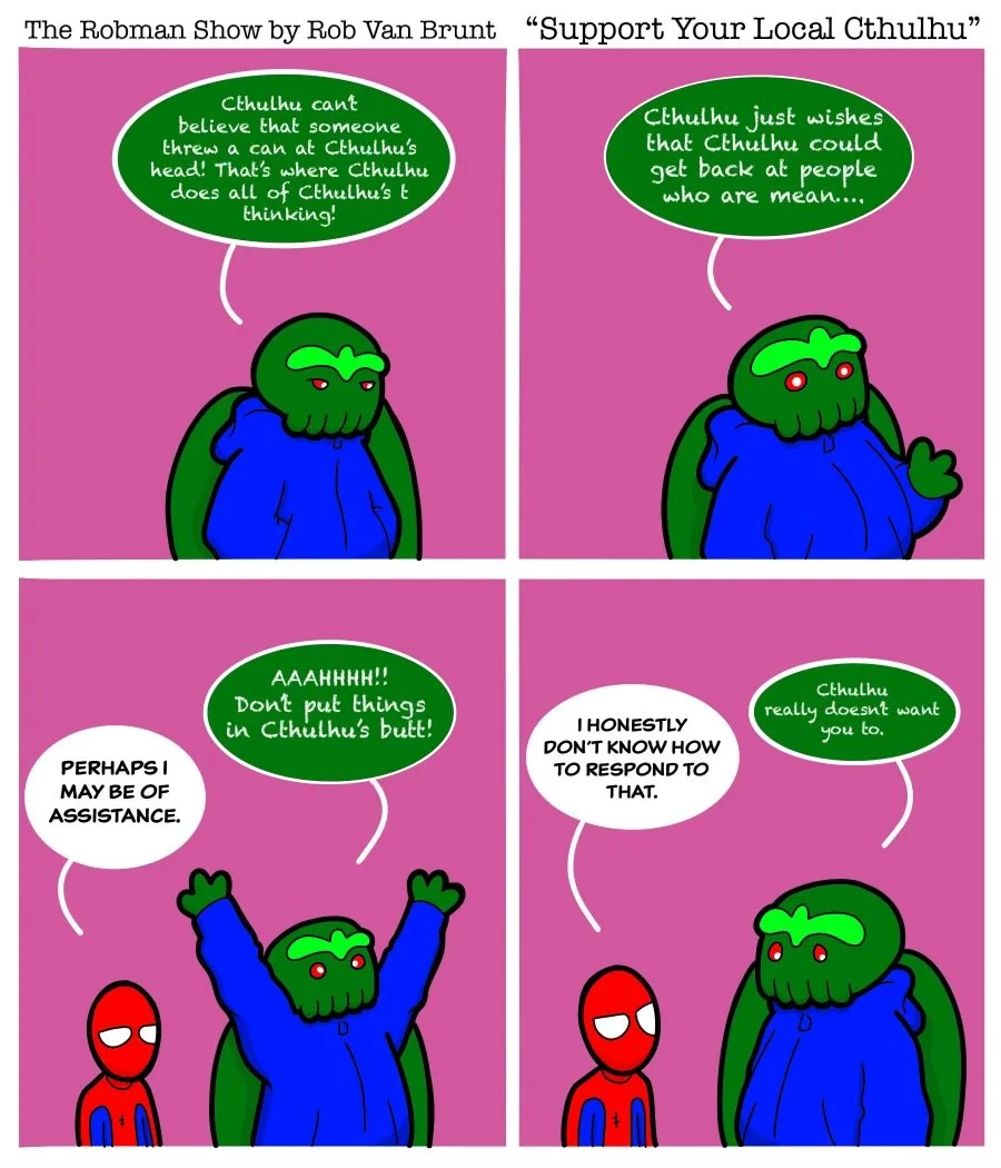 THE ROBMAN SHOW! Episode 135 “Support Your Local Cthulhu” Featured Apr 19 Written By Rob Van Brunt A new comic strip every Sunday morning from Rob Van BruntFollow The Robman Show on Instagram Rob Van Brunt For Classic Robman Show Comics Click Here!