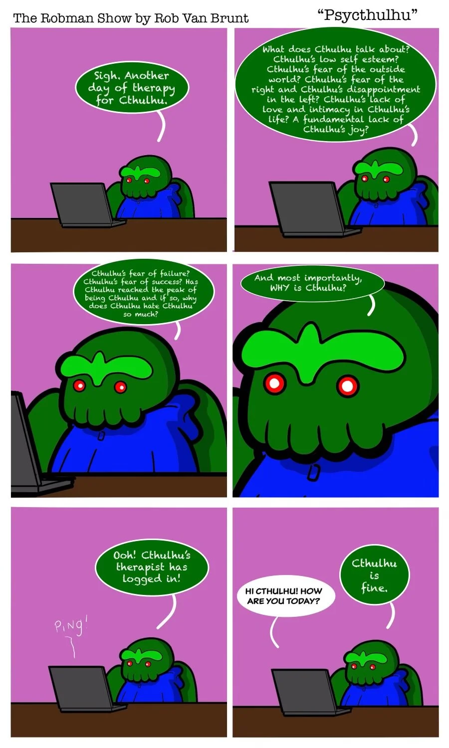 THE ROBMAN SHOW! Episode 102 “Psycthulhu” Featured Aug 17 Written By Rob Van Brunt A new comic strip every Sunday morning from Rob Van BruntFollow The Robman Show on Instagram Rob Van Brunt For Classic Robman Show Comics Click Here!