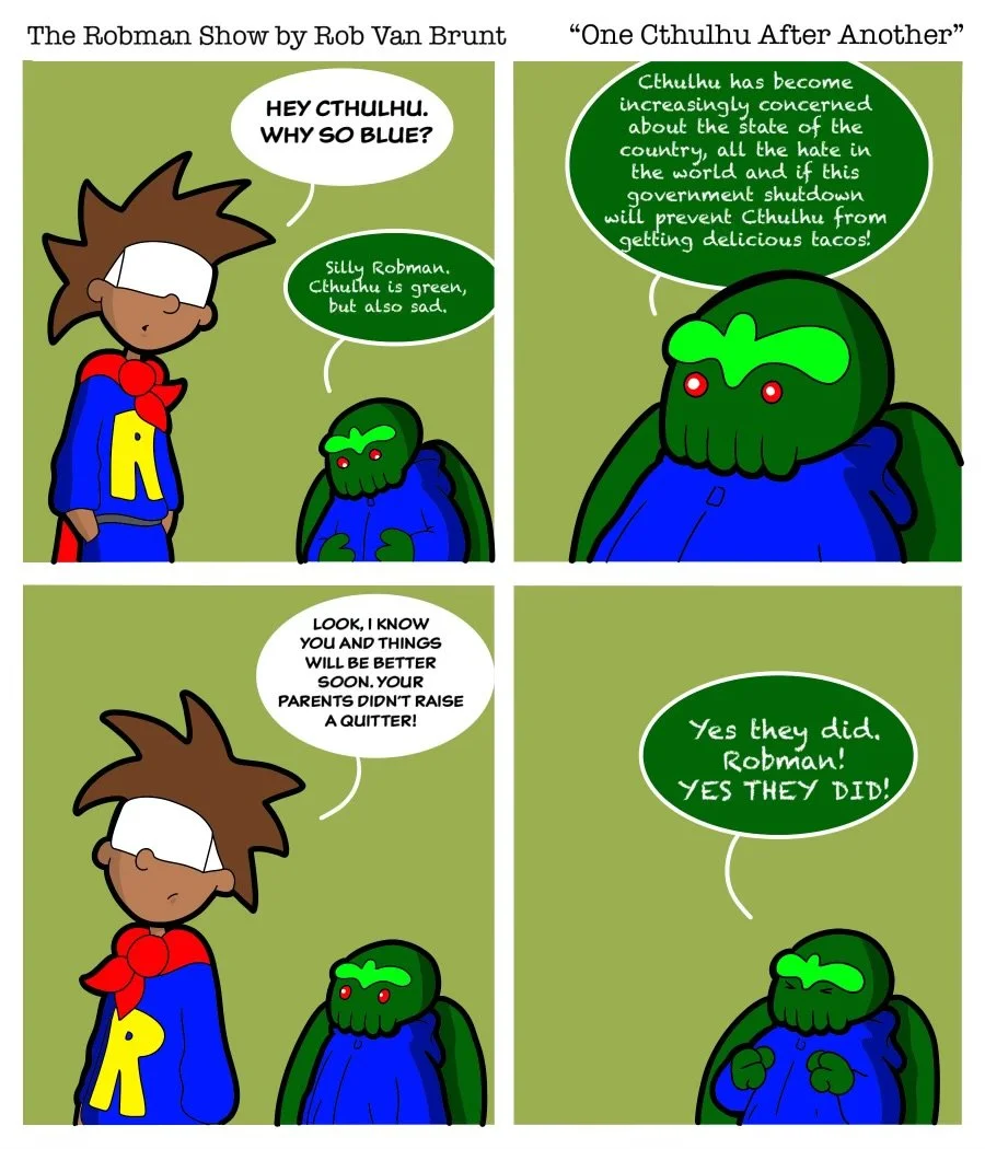 THE ROBMAN SHOW! Episode 109 “One Cthulhu After Another” Featured Oct 6 Written By Rob Van Brunt A new comic strip every Sunday morning from Rob Van BruntFollow The Robman Show on Instagram Rob Van Brunt For Classic Robman Show Comics Click Here!