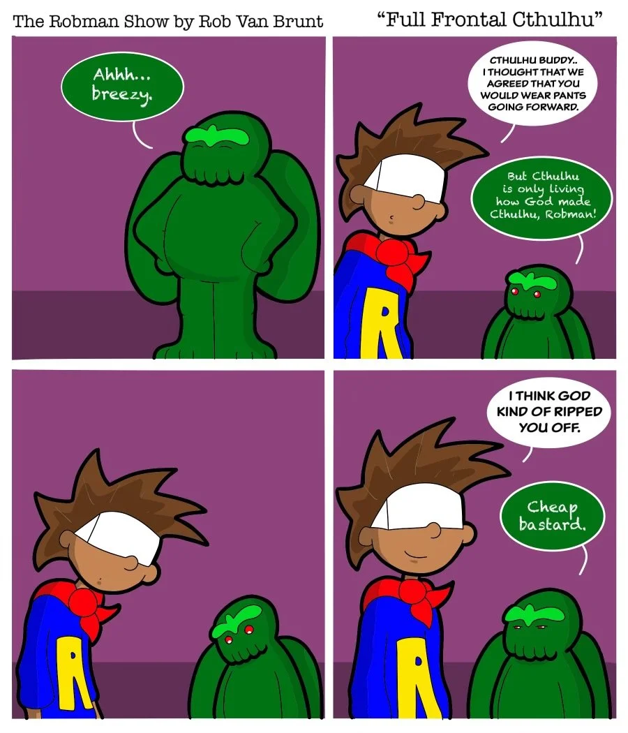 THE ROBMAN SHOW! Episode 117 “Full Frontal Cthulhu” Featured Nov 30 Written By Rob Van Brunt A new comic strip every Sunday morning from Rob Van BruntFollow The Robman Show on Instagram Rob Van Brunt For Classic Robman Show Comics Click Here!