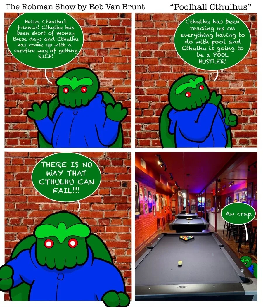 THE ROBMAN SHOW! Episode 124 “Poolhall Cthulhus” Featured Jan 18 Written By Rob Van Brunt A new comic strip every Sunday morning from Rob Van BruntFollow The Robman Show on Instagram Rob Van Brunt For Classic Robman Show Comics Click Here!