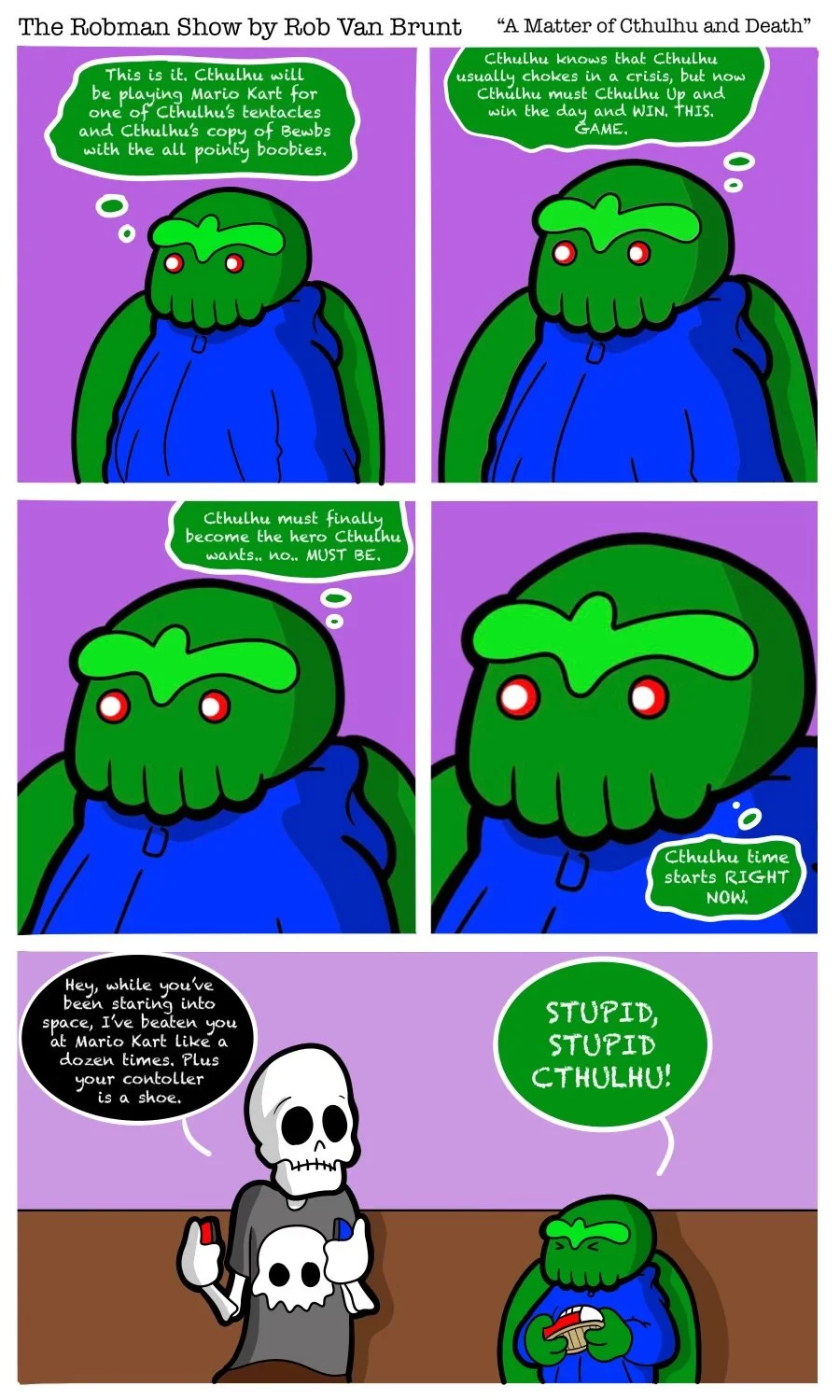 THE ROBMAN SHOW! Episode 128 “A Matter of Cthulhu and Death” Featured Feb 15 Written By Rob Van Brunt A new comic strip every Sunday morning from Rob Van BruntFollow The Robman Show on Instagram Rob Van Brunt For Classic Robman Show Comics Click Here!